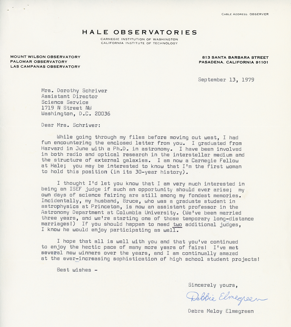As an alumna, Elmegreen kept in touch with the Society and has shown support for its research competitions.