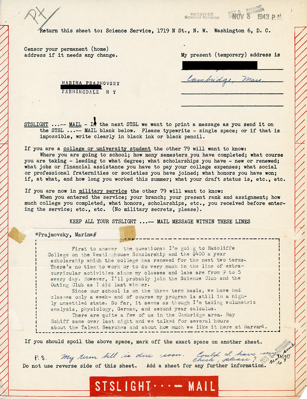 After STS, Meyers kept in touch with fellow alumni. Here is a note she wrote to other 1942 STS finalists while she was studying at Radcliffe College.