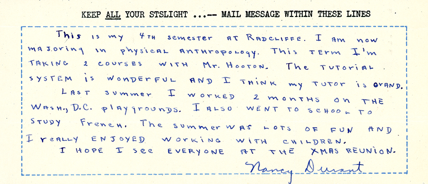 Durant Edmonds made lifelong friends at STS. She wrote this note to her fellow 1942 STS alumni while she was studying at Radcliffe College.
