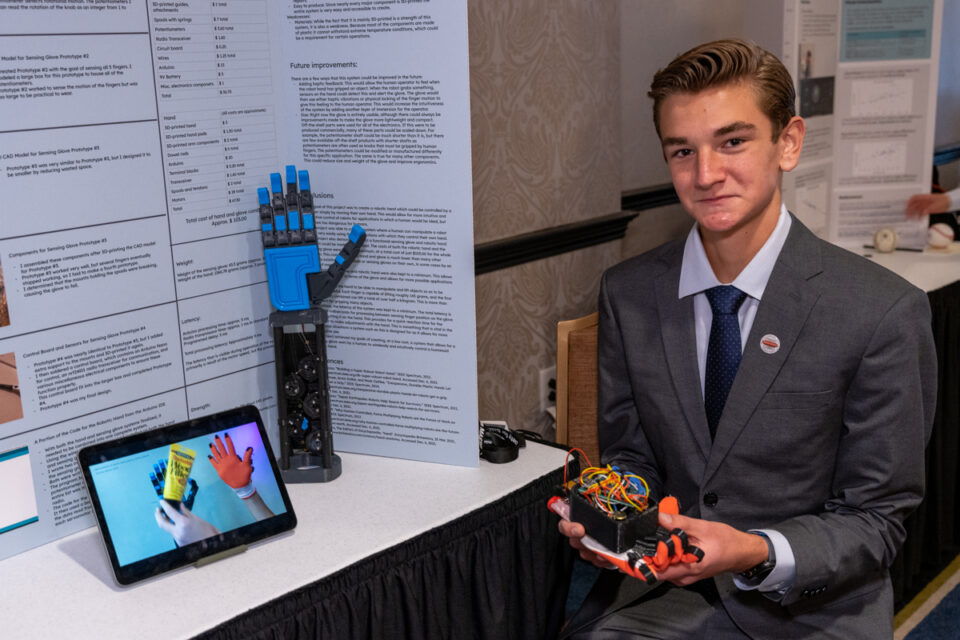 Thomas Aldous won the $25,000 Samueli Foundation Prize for designing a remote-controlled robotic hand, as well as for his leadership, collaboration and critical thinking skills.