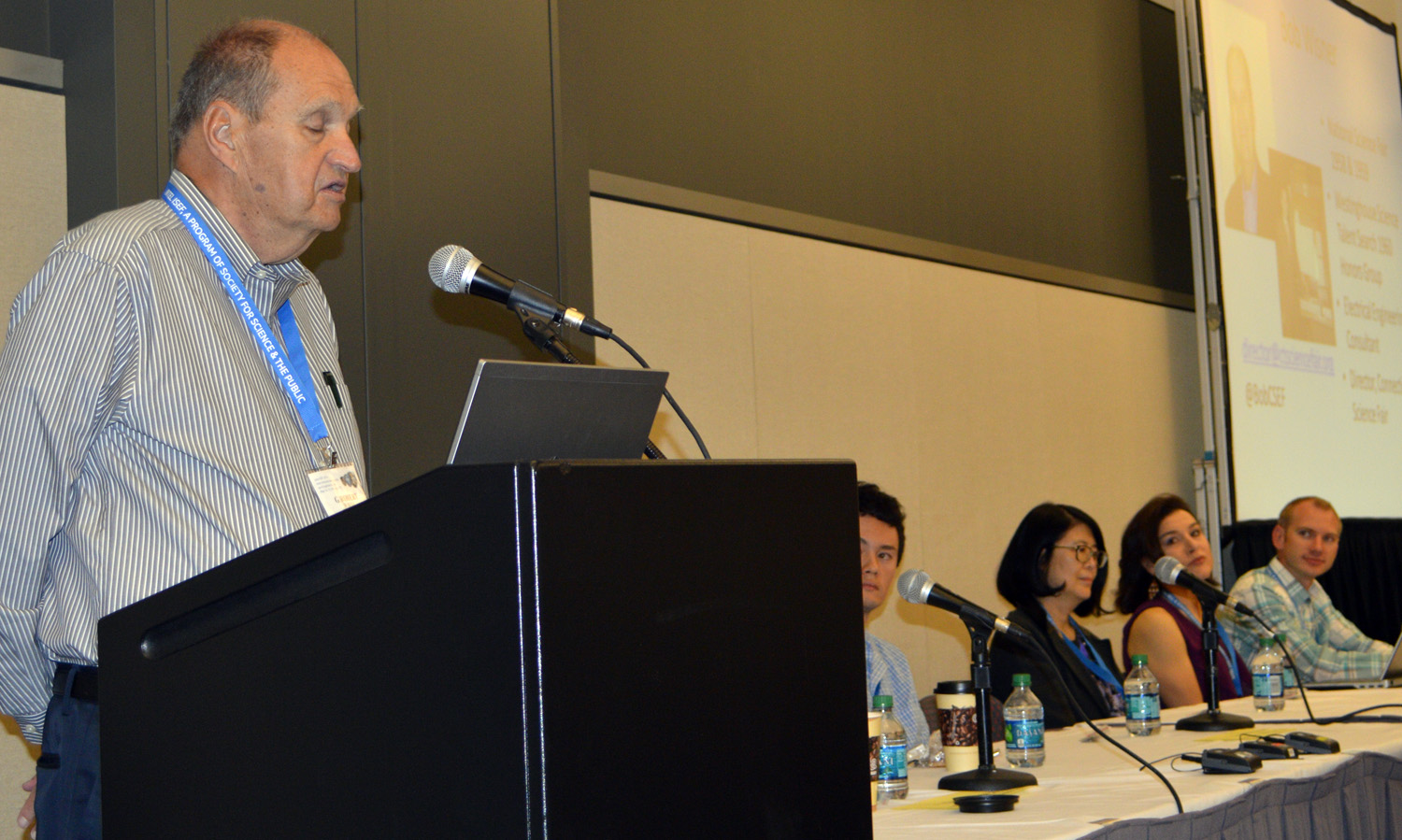 Bob Wisner, a 1958-1959 alumnus of ISEF’s early forerunner, the National Science Fair, opened the panel. Bob began his science fair career as a 7th grade teeny-bopper. His accomplishments were far from teeny, however- Bob’s research and product development went on to produce 15 patents in the laser electronics field.