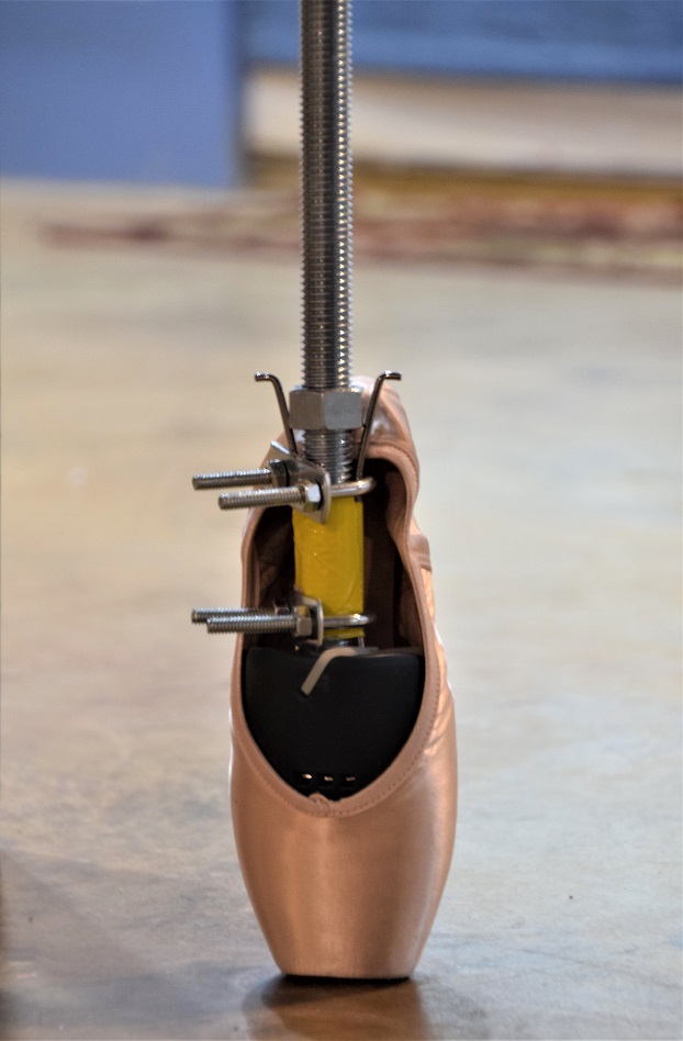 “First I created an artificial foot and leg and threaded them through a hole in a stand and attached a handle to the top of the leg,” Austin explained. She used a shoe shaper/stretcher because it is already designed to fit the shape of a shoe. Austin then turned the “leg” in an upright position to simulate a ballerina turning on pointe.