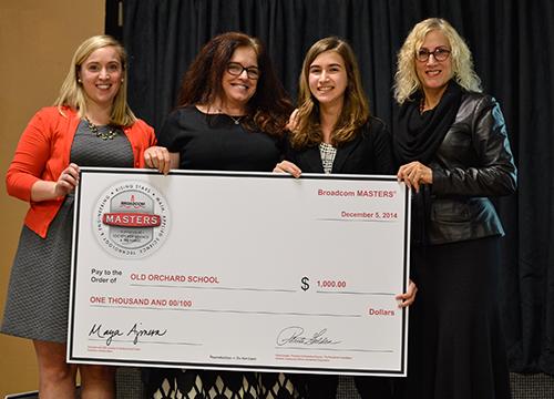 On Friday, December 4, Old Orchard School received a $1,000 check to use for STEM programming, supplies, or activities from the Broadcom Foundation at a school assembly honoring Holly Jackson, top winner of the 2014 Broadcom MASTERS.