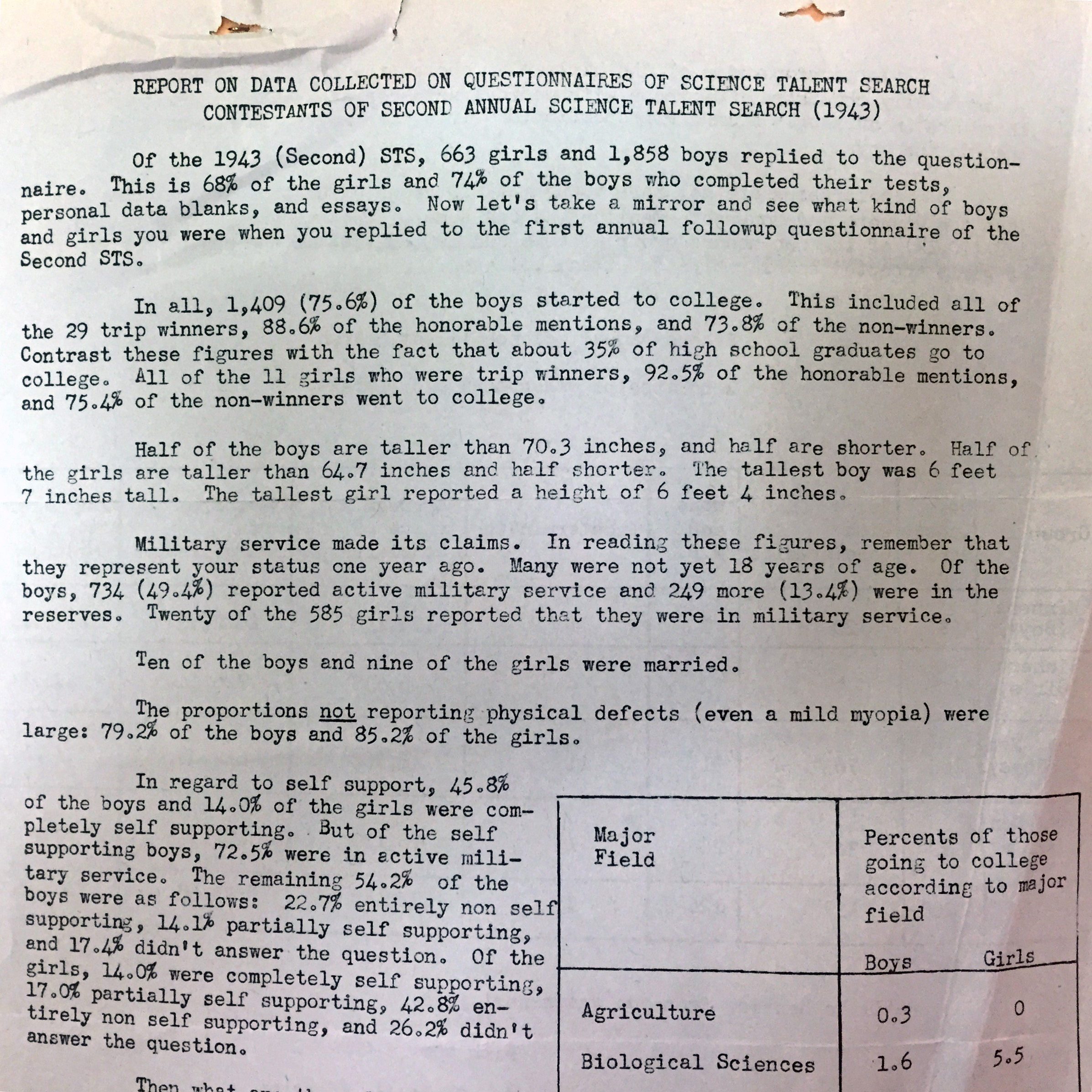 It means that nearly 50% of Science Talent Search entrants headed directly into active duty after their senior years of high school; that 19 entrants of the Science Talent Search were already married; and that nearly 50% of boys who entered the Search already fully supported themselves: