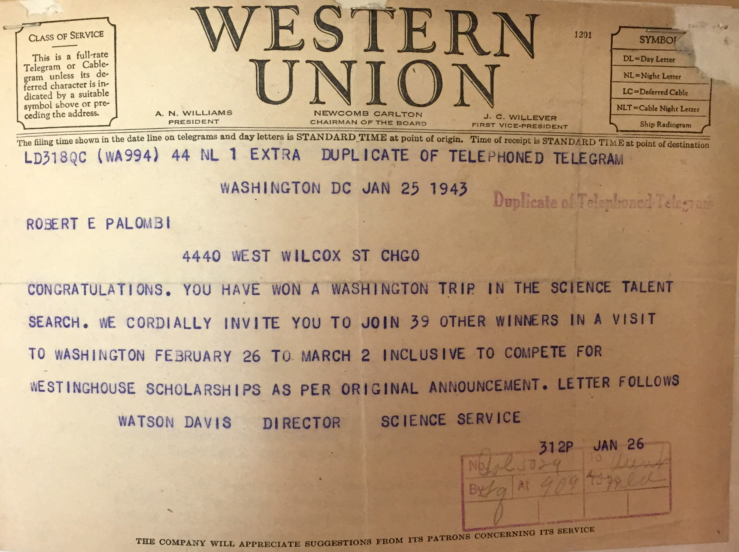 Well, for one thing it means that Science Talent Search finalists were informed that they had been selected by telegram: