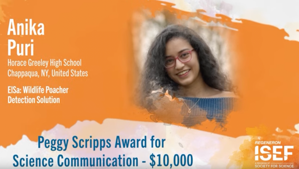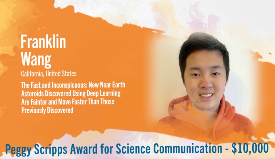 The Peggy Scripps Award for Science Communication will be given to the finalist who is best able to communicate their project to the general public, explaining both the science and its potential impact on society. The award will be used by the winner to cover post-secondary educational expenses.
