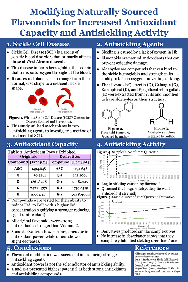 View PosterKamisi Adetunji, 17, of Holly Springs, investigated a possible treatment for sickle cell disease (SCD) for her Regeneron Science Talent Search biochemistry project. SCD is a common genetic blood disorder found mostly in Africans and those of African descent, in which red blood cells change from a disc shape to a crescent (sickle) shape and block blood flow. The main cause of this change is the removal of an oxygen atom from hemoglobin. Kamisi knew that aromatic aldehydes, which are chemical compounds that bind easily to oxygen, can prevent hemoglobin from losing oxygen. She further knew that flavonoids are natural antioxidants that neutralize oxygen-robbing free radicals. She therefore tried combining the two, extracting flavonoids from fruit and modifying their structures with aldehydes to increase their anti-sickling ability. She hopes her promising results might advance research on a treatment for SCD.