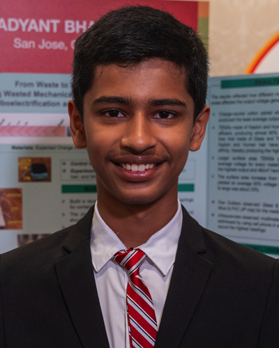 Adyant Bhavsar, 13, San Jose, Calif.; won the $10,000 Lemelson Award for Invention, awarded by The Lemelson Foundation to a young inventor creating promising product-based solutions to real-world problems. Adyant created a low-cost, eco-friendly version of a triboelectric nanogenerator. This device generates electricity from the mechanical energy of two touching objects when they separate.